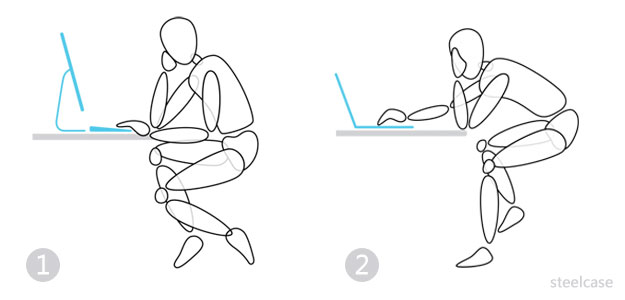 根據科技網站Business Insider,引用家具公司Steelcase的調查研究,歸納出幾種一般上班族必須避免的錯誤姿勢: